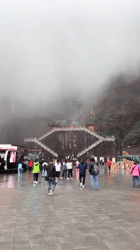 Wir kommen oben an und sehen erst mal nichts. Denn wir stehen mitten in der Nebelwand. Wir sollten eigentlich einen tollen Ausblick von hier aus auf die 999 Stufen der steilen Himmelstreppe und zur Tianmen Cave haben, allerdings sehen wir die ersten 99 Stufen und dann verschwindet alles in einer weißen Wand. Meine Hoffnung, dass, wenn wir die gefühlt unendlich lange Rolltreppe mitten im Berg nehmen, oberhalb der Wolkendecke mit einer atemberaubenden Aussicht belohnt werden, wurde knapp 20 Minuten, nach dem Ende aller Rolltreffen, enttäuscht. Hier oben war die Hand vor Augen kaum noch zu sehen und wir waren sehr froh, dass wir die letzten 3 Monate unsere Handschuhe, Mütze und Thermoshirt durch die Welt mitgeschleift haben. Heute war ihr Tag gekommen. Die Glasbrücke mit ihrem durchsichtigen Boden in schwindelerregender Höhe, auf die ich mich schon sehr gefreut habe, brauchte ich auch gar nicht erst ansteuern. Heute sah sieh aus, als hätte mir jemand den weißen Teppich ausgerollt.