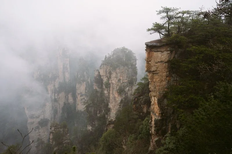 Nach einer Busfahrt geht es mit der Seilbahn direkt zum Berggipfel des Tianzi Mountains. Die Sandstein-Bergformation ist seit dem ersten Film von Avatar noch populärer geworden, als sie es wahrscheinlich durch ihre Schönheit vorher schon war. Durch ihre zum Teil sehr schmalen und hundert Meter hohen Formationen, sieht es bei leichten Wolken so aus, als würden die so „losgelösten“ Bergzipfel frei schweben. Auch wenn das Wetter deutlich besser ist, als gestern ist, bekommen wir leider die noch mystischere Version davon zu Gesicht. Durch die massive Wolkendecke taucht immer wieder mal eine der Spitzen auf. Und auch nur, wenn man lang genug an einer Stelle stehen bleibt. Am Anfang noch so kurz, dass ich es nicht mal geschafft habe, die Kamera aus dem Rucksack zu holen. Dann waren sie auch schon wieder weg.