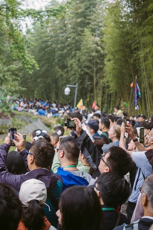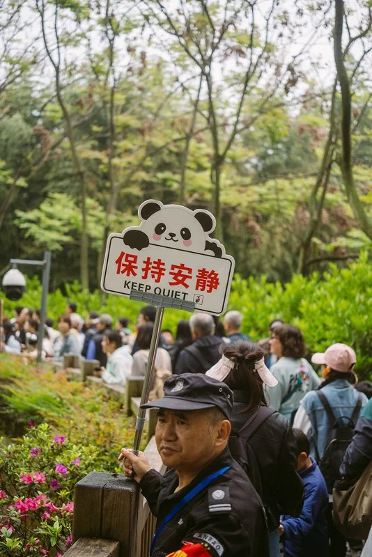 Sie sind soooo süß, etwas tollpatschig und man möchte sofort einen mitnehmen, oder zu mindest mit einem kuscheln. Warum die Pandas sich überhaupt zeigen, ist uns allerdings ein Rätsel, denn es ist ganz schön voll und das Schild mit “Quiet” (Ruhe) bringt nicht wirklich was. Die Security, die alle paar Meter steht, hat alle Hände voll zu tun, dass. es keinen Stau gibt und die Menge in Bewegung bleibt. Kaum vorzustellen, was hier in den kommenden Tagen erst abgeht. Wenn ich Panda wäre, würde ich in meiner Hütte bleiben oder mich hinter einem Busch einfach tot oder schlafend stellen und warten, bis es vorbei ist.
